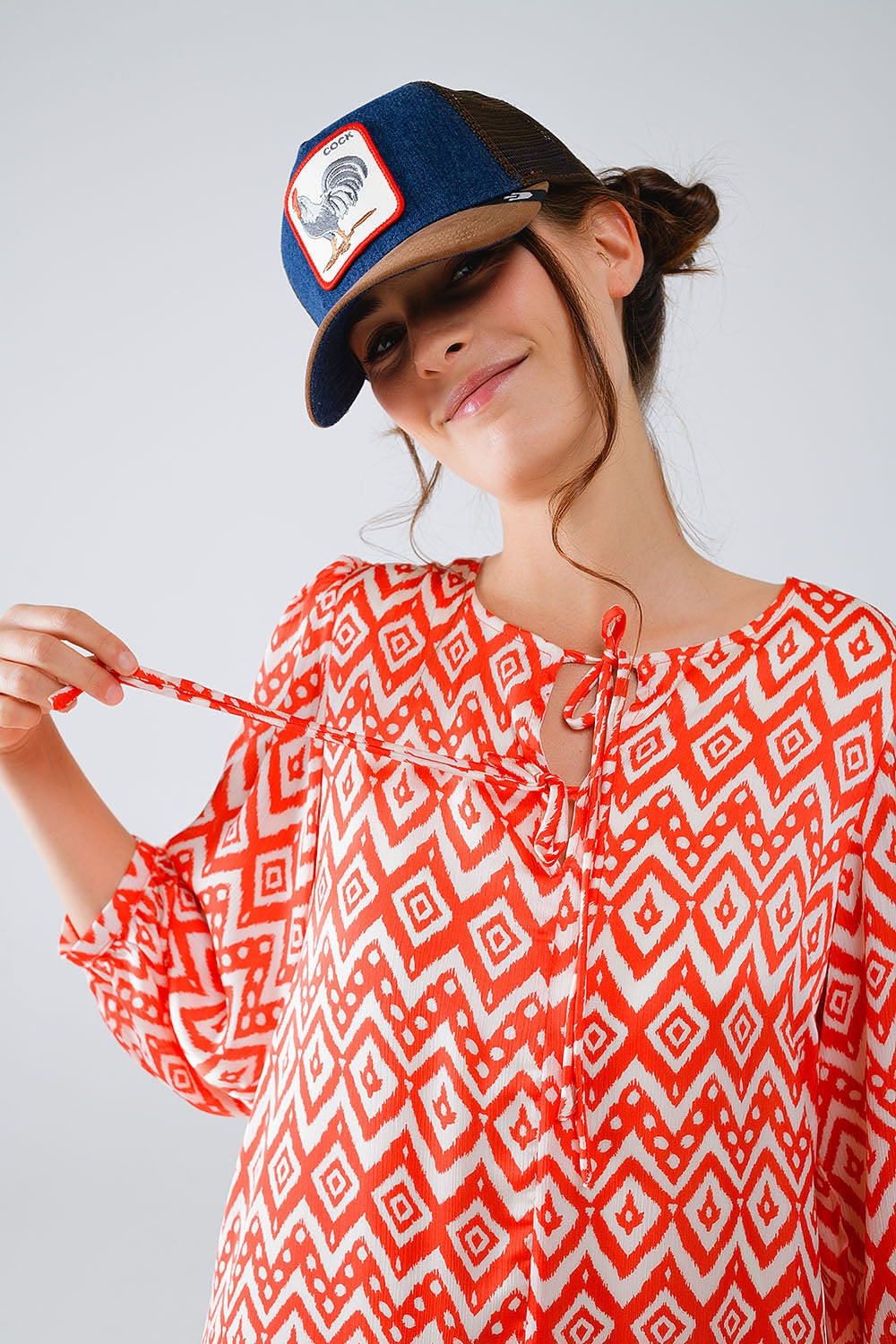 Vestido corto con detalle de lazo en la parte delantera en estampado étnico rojo